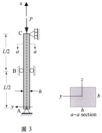【已刪除】三、圖 3 乃截面為b×h之矩形立柱ABC,其楊氏模數為E。在中點B處,x, y方向的位移被 束制,但允許z方向(與平面垂直之方向)之位移。若在x-y平面上挫屈之臨界載重( critical load)以(P
