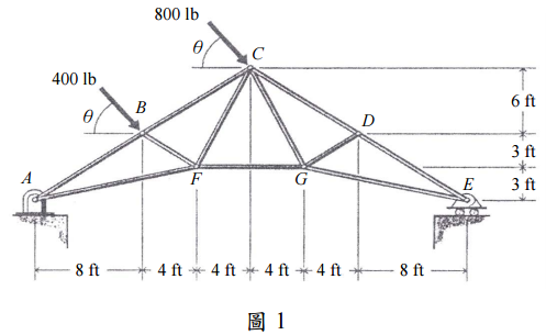 【已刪除】一、如圖 1 所示,一桁架載重和支承如圖,試求出其桿構件 BC、CF 和 FG 之內力。 (θ=30°)(25 分)