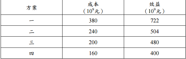 【已刪除】四、某河川局有四項欲推動之工程方案(非互斥性),每個方案的成本(cost)、效益 (benefit)如下表所示。如該河川局可動支的資金上限為 400×10