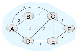 三、考慮下面標示有連結成本(Link Cost)之網路,請使用 Dijkstra 最短路徑演算法 (Shortest Path Algorithm)來計算結點(Node)F 至所有網路節點之最短路徑與路 徑成本(請使用適當之表格來呈現所有計算細節)。(20 分)