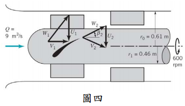 【已刪除】五、一單級軸流式輪機機械(Turbomachine),如圖四所示。若水的體積流率為 9 m