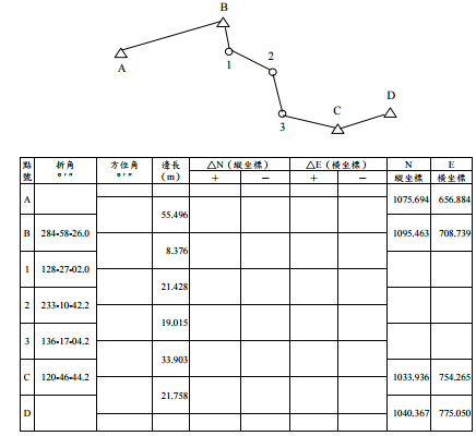【已刪除】二、如下圖為一附合導線,A、B、C、D 四個已知點的坐標及觀測折角與邊長如下表, 請將導線計算列於下表(作答於試卷上),須將所有計算式列出(並計算位置閉合 差和閉合比數)。(25 分)