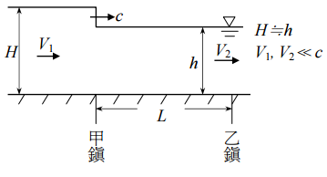 【已刪除】四、甲鎮與乙鎮距離為 ,分別座落於同一河 川之上、下游河畔,平時兩鎮旁河川之水 位相近。若時間 L t = 0時洪水到達上游之甲 鎮,其水深為H ,請估計約多少時間後該 洪水會到達乙鎮。提示如右圖: