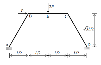 【已刪除】三、如圖所示之剛架,其支承點 A 與 D 均為固定端,同時每根構件之彈性模數與慣性 矩乘積均為常數值 EI。當 B 點承受一水平載重 P 且 E 點承受一垂直載重 2P 時,請 以傾角變位法(slope-deflection method)計算 A、B、C、D 各節點之彎矩。(若以 其他方法計算不予計分)(25 分)