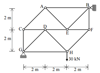 【已刪除】一、如圖所示之桁架(truss)結構,其支承點 B 為滾支承(roller),而支承點 G 則為 鉸支承(hinge)。當 H 點承受一垂直向下載重 30 kN 時,請計算 AC、BF 與 DE 三 根桿件之軸力。(20 分)