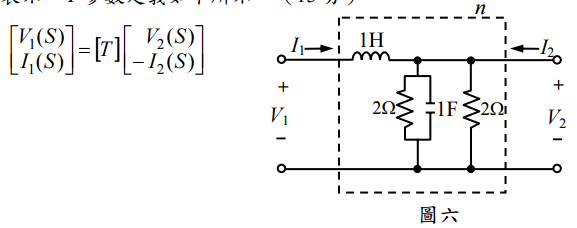 ),以 Hz 為單位。(15 分) 圖五 六、試求如圖六所示之雙埠網路 之 T 參數(傳輸參數),請以頻域(拉普拉氏變數 S) 表示,T 參數定義如下所示:(15 分)