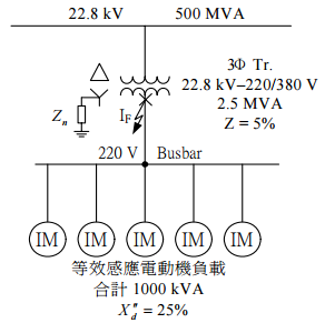 【已刪除】四、如圖所示配電系統中,三相變壓器係採系統與設備共同接地,電動機則採設備接地。 試以 2500 kVA及 22.8 kV為變壓器電源側之基準值,就變壓器低壓側中性點接地阻 抗Z