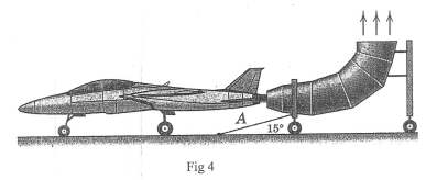 【已刪除】4. Ajet-engine noise suppressor consists of a movable duct that is secured directly behind the jet exhaust by cable A and deflects the blast directly upward. During a ground test, the engine sucks in air at the rate of 43 kg/s and bums fuel at the rate of 0.8 kg/s. The exhaust velocity is 720 m/s. Determine the tension T in the cable. (25%)