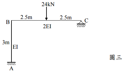 【已刪除】三、圖三所示為一平面剛架。限以彎矩分配法(moment-distribution method)求其各端點 彎矩。各桿件的斷面積同為 800cm