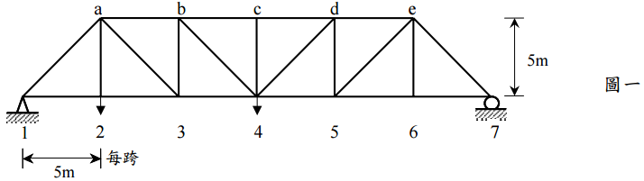 【已刪除】一、圖一所示為一平面桁架。各桿件的斷面積與材料性質相同,各跨間距亦同為 5m。 節點 2 受一向下的垂直力 120kN,而節點 4 則受一向下的垂直力 100kN。求桿件 b4, b3,c4 與 cd 的內力。(25 分)