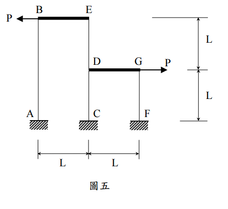 【已刪除】四、設有如圖四所示斷面均勻之桿件 ABCDE,B 點為 A、C 二點之中點。E 點受水平力 P 作用,試求當 B 點之垂直變位絕對值(|δ