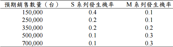 【已刪除】三、某筆記型電腦公司計畫推出 2010 新型號筆記型電腦,此時團隊設計了兩種不同型 號設計(S 與 M 系列),製造 S 系列的每年固定成本為 12,000,000 美元、製造 S 系 列每台筆電變動成本為 240 美元,製造 M 系列的每年固定成本為 18,000,000 美元、 製造 M 系列每台筆電變動成本為 260 美元。新產品售價分別為 300 美元(S 系列) 與 360 美元(M 系列),行銷部門預期此兩系列每年銷售數量及發生機率如下所示: