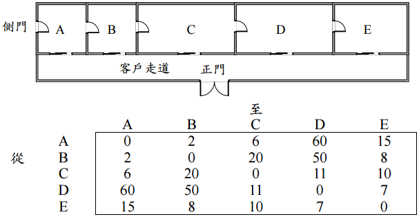 【已刪除】⑴下圖是一維修工廠目前的平面圖,ABCDE 五個部門分別負責維修一類電子設備。 客戶從正門進入客戶走道後,將需維修的設備經由窗口交給部門內的人員。各部 門的維修人員由左邊側門進入,經過連通的小門進入其部門進行維修工作。 ABCDE 的寬度分別為 10,10,20,20,15 尺寬。由於各部門需共用維修工具, 下表中的每一個數字表示維修人員在兩部門間行走的次數。問題甲:如以部門間 中心點的距離計算部門間的距離,請計算目前維修人員總共須走多少尺?(5 分) 問題乙:如果將部門間的隔間牆拆除重建,由左至右部門的排列變更為 CDABE, 請計算改建後維修人員總共須走多少尺?(5 分)問題丙:共有多少不同的排列 法?(5 分)問題丁:那一種排列總步行距離最短?(5 分)