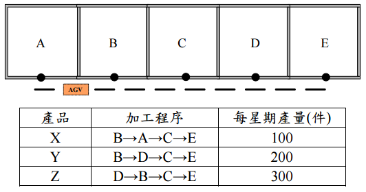 【已刪除】⑵工廠中有 ABCDE 五個十尺見方的加工部門,XYZ 三種產品加工的程序與數量如 下表所示。以無人搬運車(AGV)沿著其軌線傳遞加工的產品,各部門旁中點的 黑點為裝卸貨的位置。B 部門不能在最左邊,AC 不相鄰,E 在最右邊。問題甲:重 新佈置各部門的位置;(10 分)問題乙:無人搬運車行走的最短總和距離為多少 尺?(10 分)