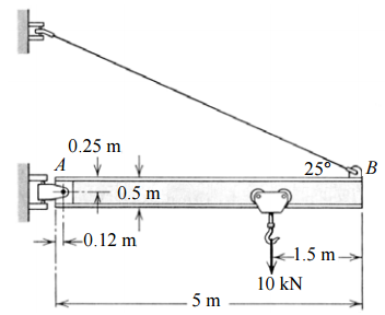 【已刪除】二、一懸臂式起重機表示如下,請計算支撐纜繩的張力 T 與支承 A 點所承受的力量。此 梁為標準 0.5 m 之 I 型梁,每公尺重 95 kg。(20 分)