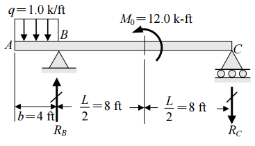 【已刪除】五、一梁結構如下,有一均佈外力q=1.0 k/ft施於AB之間,另有一力矩M