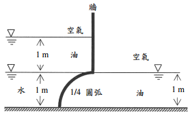 【已刪除】二、如圖為一個與垂直紙面無關的二維(two-dimensional)問題,直立牆下方為一個四分 之一的圓弧,牆之兩側為靜止之液體(油之比重為 0.8)。取垂直紙面之寬度為 1 m, 試求整個牆體(包括直立與圓弧部分)受液體作用總力之大小(單位:牛頓)與方 向。(25 分)