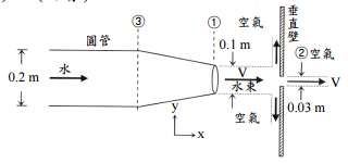 。假設截面①與②之水束維持水平 (中心軸皆通過圓孔中心)且截面不變,忽略摩擦效應,試推求垂直壁之x向受力 (單位:牛頓)。(25 分)