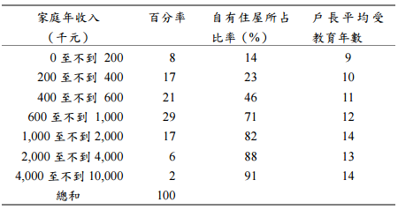 【已刪除】五、下表為去年某地區家庭年收入狀況、自有住屋所占比率及戶長平均受教育年數分配 表,請計算該地區家庭之平均收入(3 分)、戶長平均受教育年數(3 分)、自有 住屋所占比率(4 分)及自有住屋家庭之平均收入(5 分)。