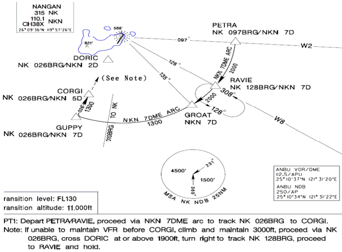 【已刪除】六、下圖為馬祖南竿機場 PT1(PETRA ONE)到場圖,假設航機自 W2 航路由東向西飛航 至南竿機場,位於 PETRA 東面高度為 4000 呎,管制員頒發「MAINTAIN 4000 FEET,CLEARED TO CORGI DME FIX VIA PETRA ONE ARRIVAL」之指示予航機, 如你是該航機駕駛員,該如何飛航?如管制員頒發「CLEARED TO CORGI DME FIX, DESCEND VIA PETRA ONE ARRIVAL」之指示,又該如何飛航?(10 分)