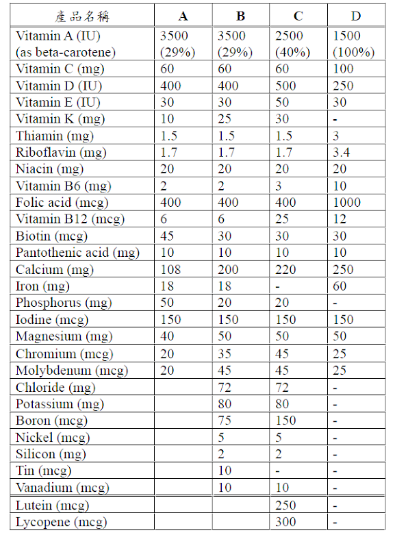 三十二歲陳小姐懷孕剛滿六週,到社區藥局選購綜合維生素,你會優先推薦使用下列那個配方(A、B、C、D)?請說明原因。(20分)
