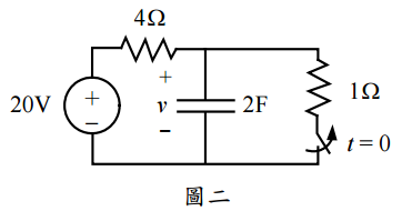 【已刪除】二、圖二電路 t =0 之前,電路已達穩態。在 t =0 瞬間將開關斷路(open-circuited),求 t > 0 之電容電壓 v,並回答 v(t = 0)及 v(t →∞)之值。(20 分)