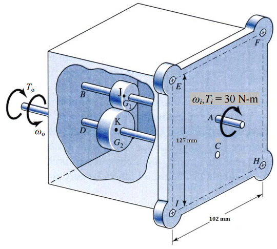 。該二軸經由固定在減速器箱體的 A、B、C、D 四個軸承所支撐,該箱體係以 E、F、I、H 四顆同樣尺寸的螺桿固鎖於 馬達箱體上(未圖示);齒輪 G