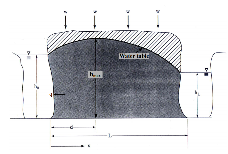 ⑴推導地下水位(Water table)之控制方程式。(5 分)