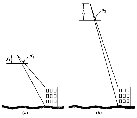 三、假設下圖中,圖(b)之航高為圖(a)之航高的二倍,圖(b)之焦距亦為圖(a)之焦距的二 倍,(a)、(b)二者像比例尺之比為若干?以鑲嵌或判釋分析影像目的而言,宜採用何 者?何故?(20 分)