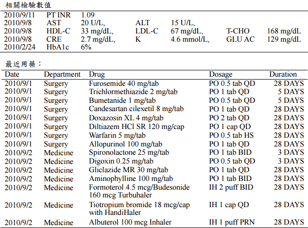 【已刪除】二、李先生八十五歲,170 公分,60 公斤,診斷有糖尿病、高血壓、痛風、睡眠失調、 憂鬱症及氣喘,對 aspirin、sulfa drugs、penicillins 過敏,其最近的用藥及檢驗數值列 於下表,2010/9/12 你為此病人進行藥物治療管理(medication therapy management), 請列出此病人所有藥品相關問題,並以 PAP(problem, assessment, plan)方式呈現 藥師的評估與建議。(25 分)