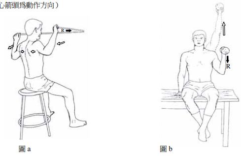 2 對於長胸神經(long thoracic nerve)受傷的病患,下列何者是恰當的訓練?(圖中 R 表示阻力方向, 空心箭頭為動作方向)