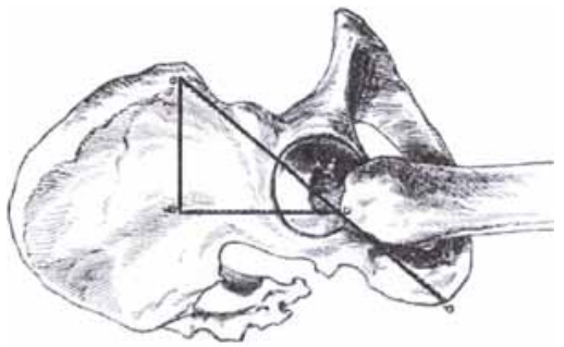 (A)此三角形稱為Bryant’s triangle (B)比較兩側可評估是否有coxa vara,或是先天性髖關節脫臼 (C)其中一條線連接前上腸骨棘(anterior superior iliac spine)和大轉子頂點(tip of the greater trochanter) (D)其中一條線通過前上腸骨棘(anterior superior iliac spine)與後下腸骨棘(posterior inferior iliac spine)