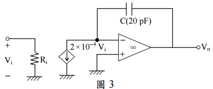 【已刪除】三、圖 3 電路中假設運算放大器為理想,請求出在小訊號弦波穩態下當電壓增益