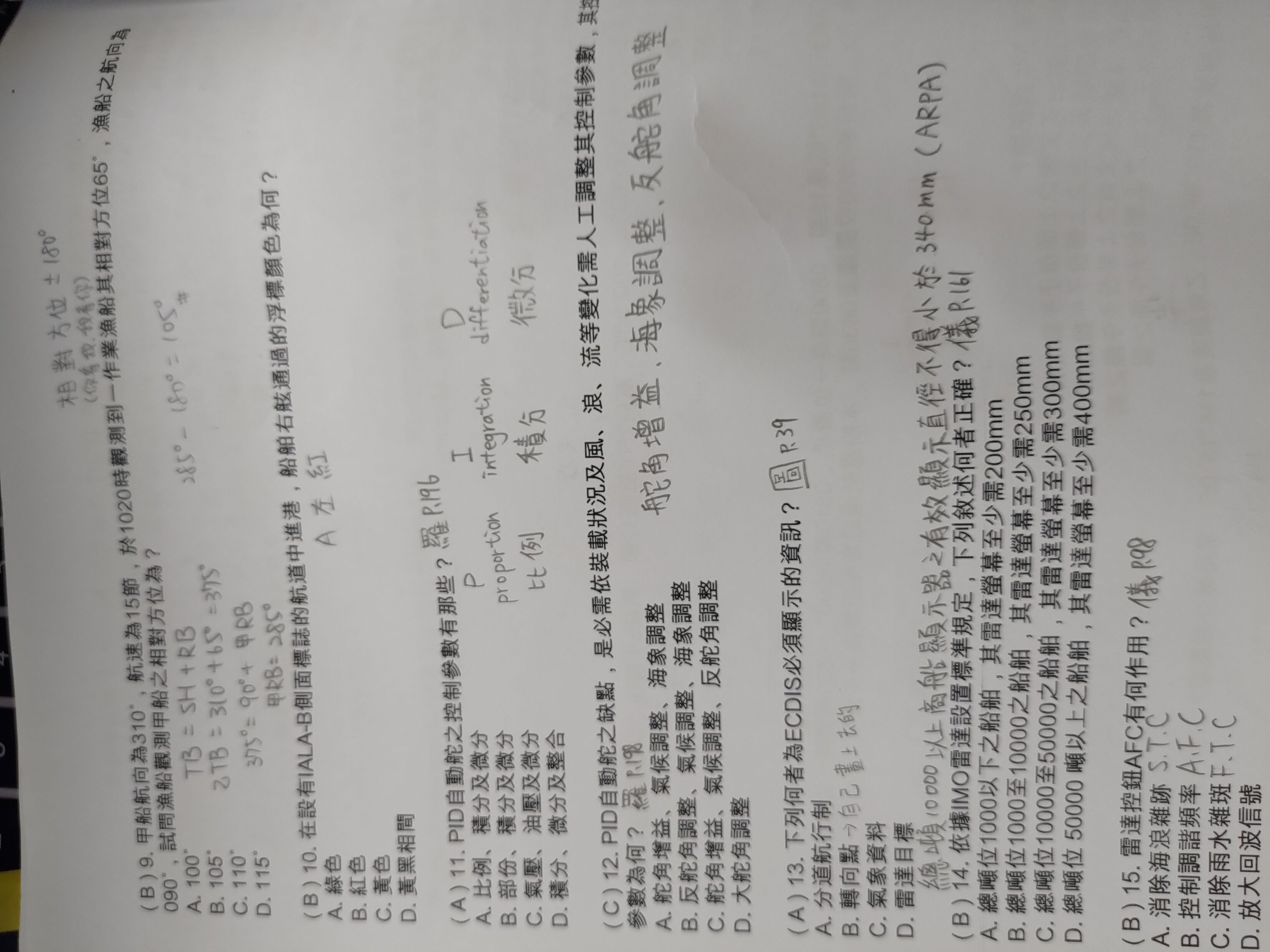 9. 甲船航向為310˚,航速為15節,於1020時觀測到一作業漁船其相對方位65˚,漁船之航向為 090˚,試問漁船觀測甲船之相對方位為?
