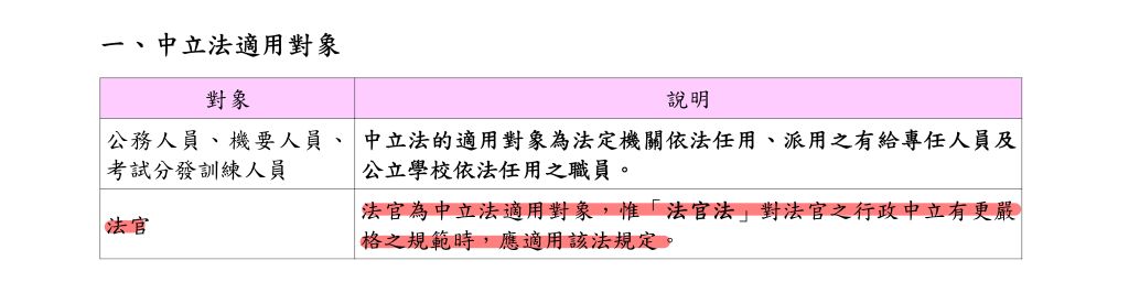 答:法官為中立法之適用對象,惟公務人員行政中立法第1條第2項規定,其他法律另有嚴格規定者,適用其他有關之法律。是法官法對法官之行政中立有更嚴格之規範時,自應適用該法規定。