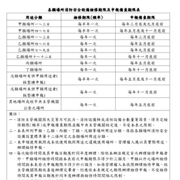 依據消防安全設備檢修及申報辦法內之各類場所消防安全設備檢修期限及申報備查期限表內之規定: