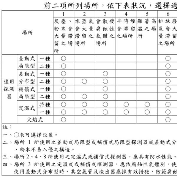 │三 場所 3 所使用之定溫式或補償式探測器,應依腐蝕性氣體別,│