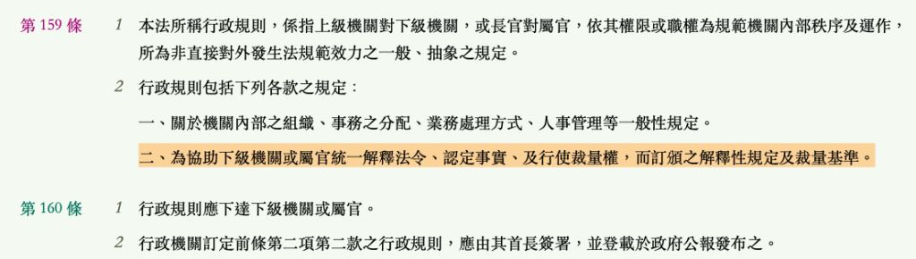行政程序法第 159 條 (行政規則之定義) I.本法所稱行政規則,係指上級機關對下級機關,或長官對屬官,依其權限或職權為規範機關內部秩序及運作,所為非直接對外發生法規範效力之一般、抽象之規定。 II.行政規則包括下列各款之規定︰ 一、關於機關內部之組織、事務之分配、業務處理方式、人事管理等一般性規定。 二、為協助下級機關或屬官統一解釋法令、認定事實、及行使裁量權,而訂頒之解釋性規定及裁量基準。 |