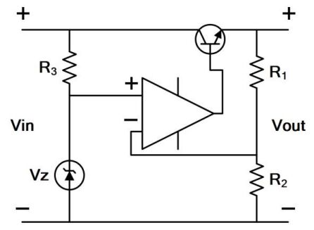 52. 下圖之穩壓電路,設電晶體 B 與 E 間的順向壓降為 Vbe,稽納二極體的稽納電壓為 Vz,則其輸出電壓 Vout 為