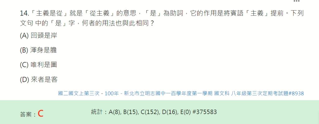(C)14.「主義是從」就是「從主義」的意思,「是」為助詞,它的作用是將賓語「主義」提前。下列文句 中的「是」字,何者的用法也與此相同?