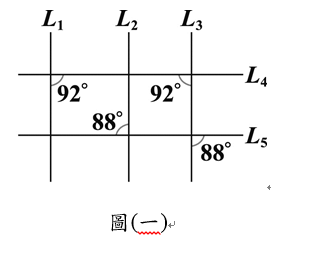 圖(一)為平面上五條直線L1、L2、L3、L4、L5相交 的情形。根據圖中標示的角度,判斷下列敘述何 者正確?