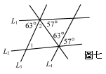 如右圖七,下列敘述何者正確?(A) L1//L2 (57+57+63=177, 沒有同側內角互補) (B) L3//L4 (180-57-63=60, 內錯角沒有和57等角)(C)∠2=63° (180-63-57=60, 不是63)