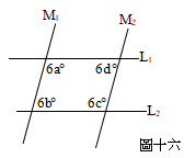 如圖十六,L1 //L2,M1 //M2 , 所形成的四邊形的四個內角分別為6a°、6b°、6c°、6d°, 若6a°是鈍角,且a、b、c、d 皆為質數, 則滿足此條件的a、b、c、d共有幾組 ?(B)3組