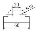 54. 磨削完成如下圖所示之尺寸,外部尺寸為 60mm,R 之中心距離尺寸為20mm,半徑 R 為 10mm,如單邊研磨裕留量為 0.1mm,即未磨削前外部尺寸為 60.2mm,則 R 值尺寸應為