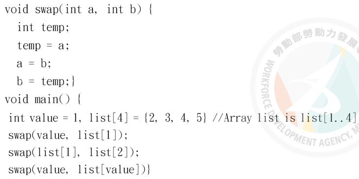 103. 依據下列仿 C 語言之程式語法結構,若以 Pass-by-value 方式進行參數傳遞,程式在執行後,下列之結果哪些是正確的?