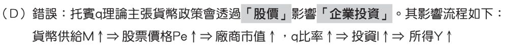 (D)托賓 q 理論強調貨幣政策透過股價影響消費