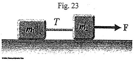 28 .Two blocks connected by a rope of negligible mass are being dragged by a Phorizontal force as in Fig. 21. Suppose that F =68.0N, m1 =12.0kg, m₂=18.0kg and the coefficient of kinetic friction between each block and the surface is 0.100. Which answers are correct in the following?