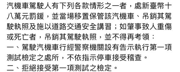(E)駕駛人拒絕接受酒精濃度之測試檢定