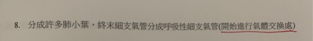 終末細支氣管分成呼吸性細支氣管(開始進行氣體交換處),故為呼吸性細支氣管