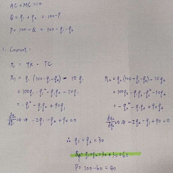 7 假設市場上有兩家廠商在生產口罩,其平均成本與邊際成本皆固定為 AC=MC=10,市場需求則